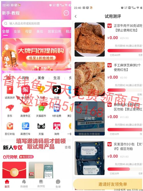 1、应用市场下载省钱鱼**也行,微信顶上搜小程序省钱鱼也行扫码下载APP登录后,填写邀请码:515168(不然无法领取试用商品)然后点击首页的“试用测评”