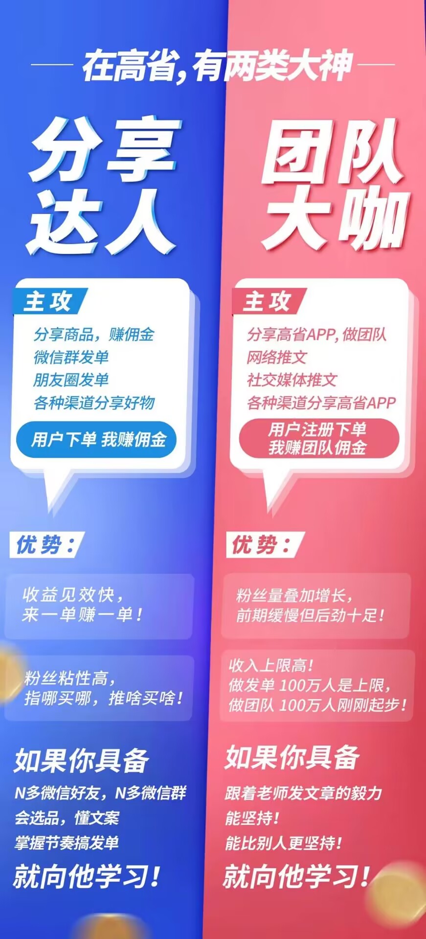 那么此类型**这么多,为什么我偏偏选择高省,因为高省的佣金是真的高,我跟官方的佣金对比过,高省是目前市场上最高的返利APP。佣金高就是趋势,谁不希望自己多赚点呢?并且加入高省之后有大佬带你,别的项目大佬很少会带你的。