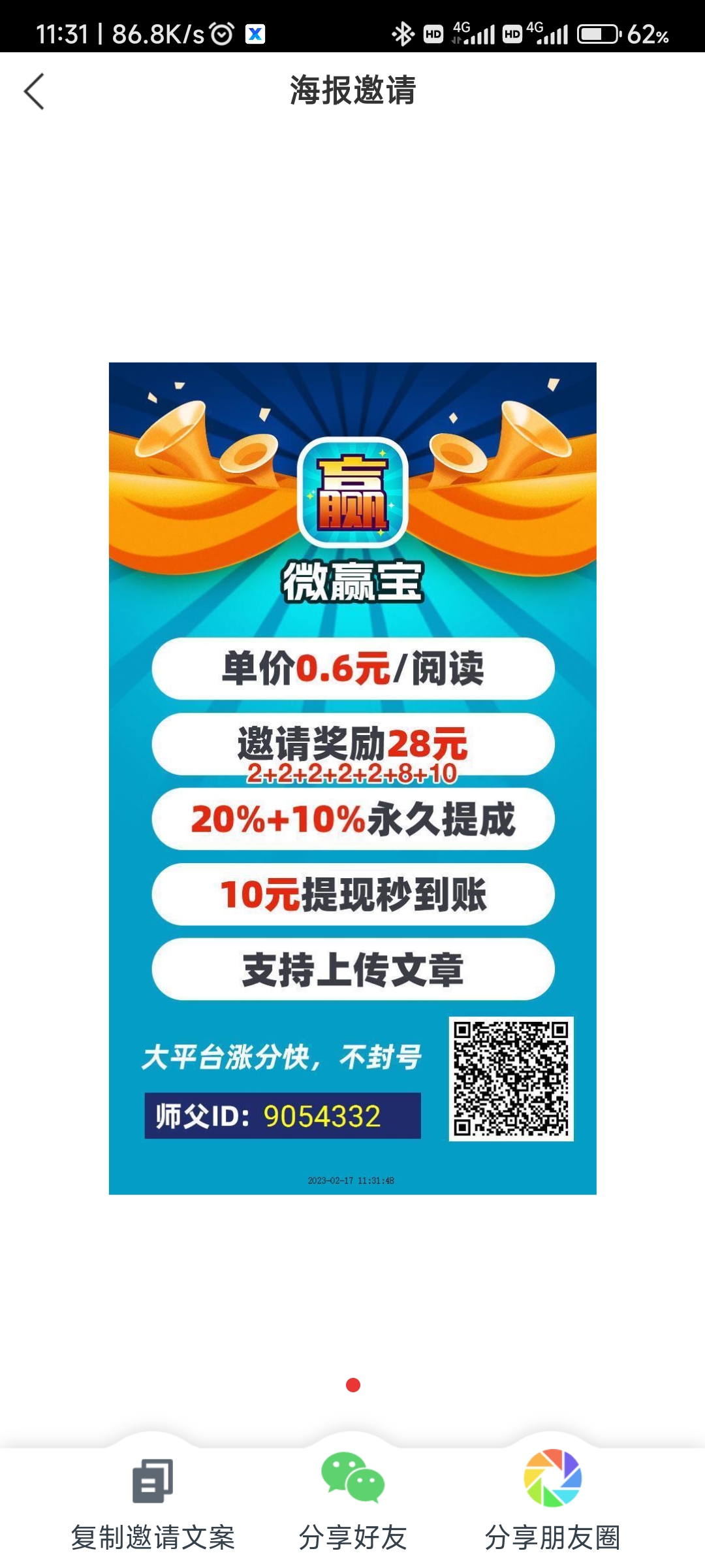 转发单价全天保持6毛/阅读,支持文章导入,不封号涨分快,好友点击人数越多,赚钱就越多