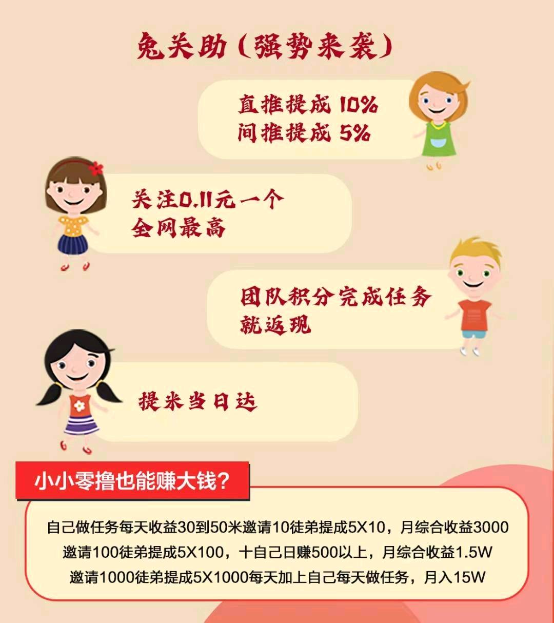 兔关助抖音关注点赞赚钱是不是真的?最近上线的兔关助,是一款抖关注赚米平台,全网最高单价0.11!两代收益无上限,一代10%,二代5%,团队长直推100,团队1000,每日上榜享受公司百分之50%提成**。