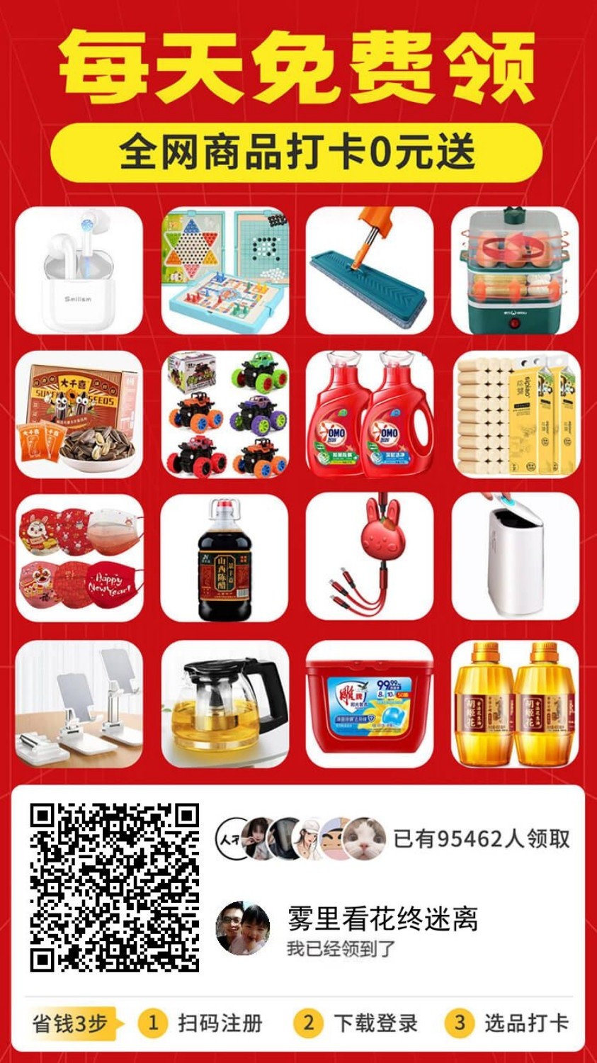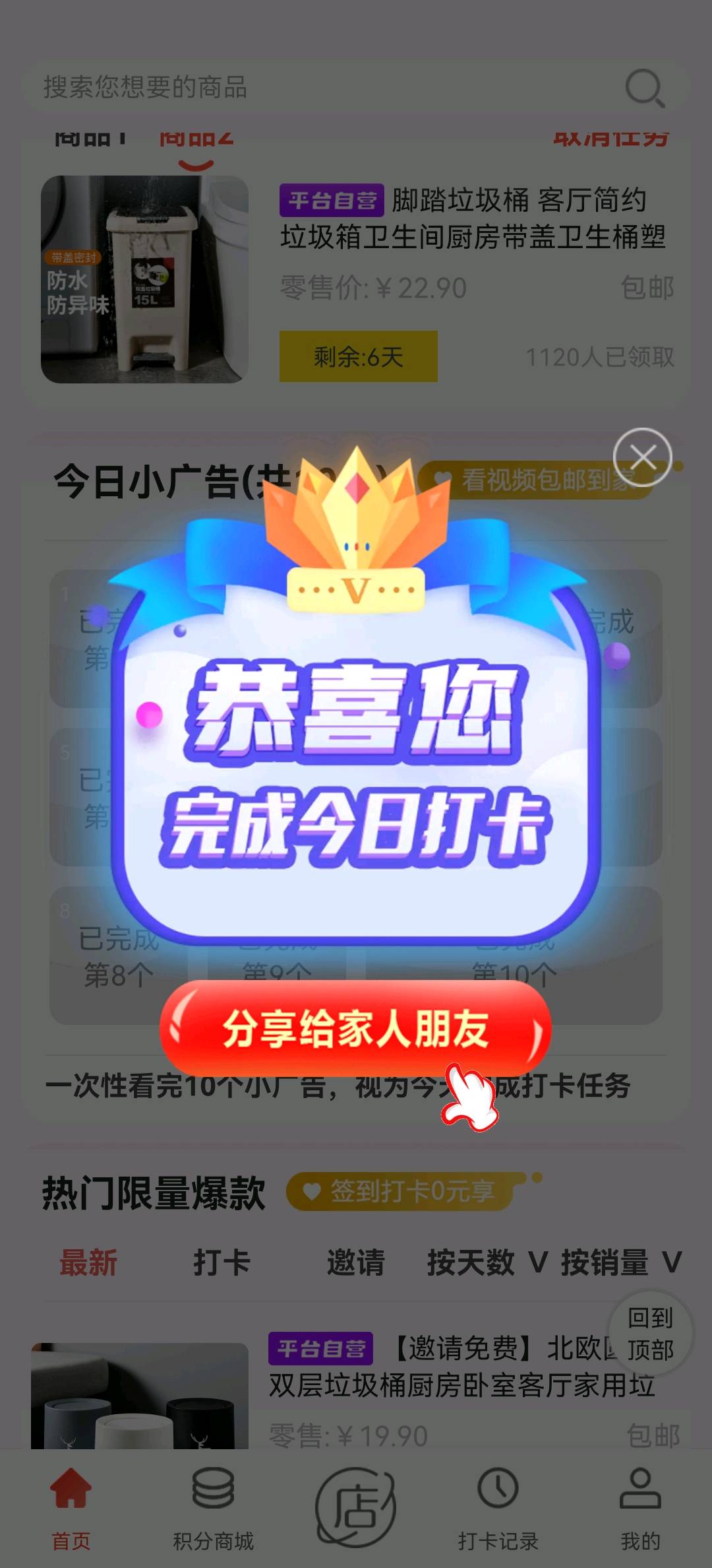 首页领取心意打卡商品,每天花两分钟打卡看下小广告,完成天数,包邮到家不花一分钱!领到一个商品后,还可以继续领商品继续打卡!