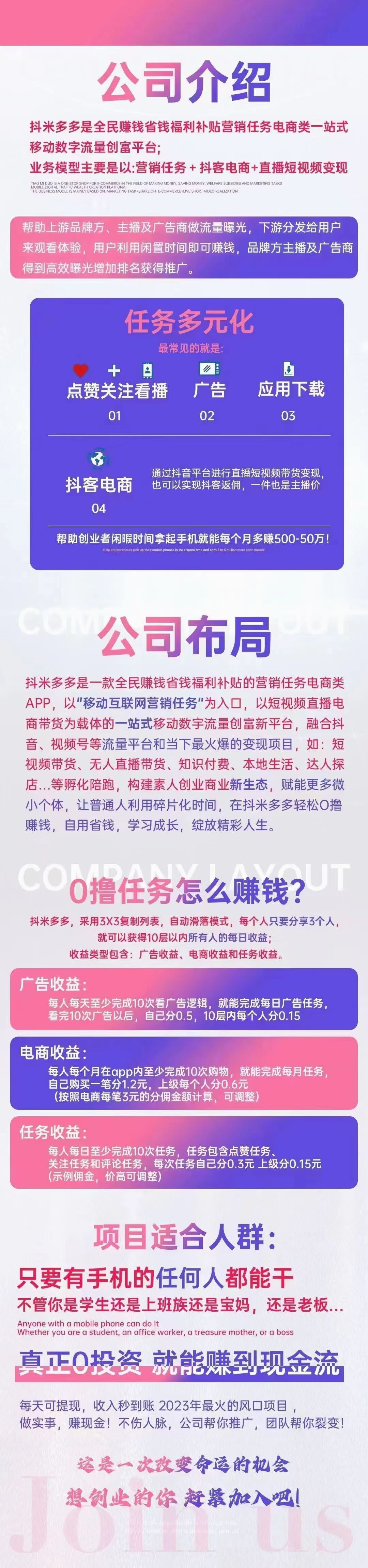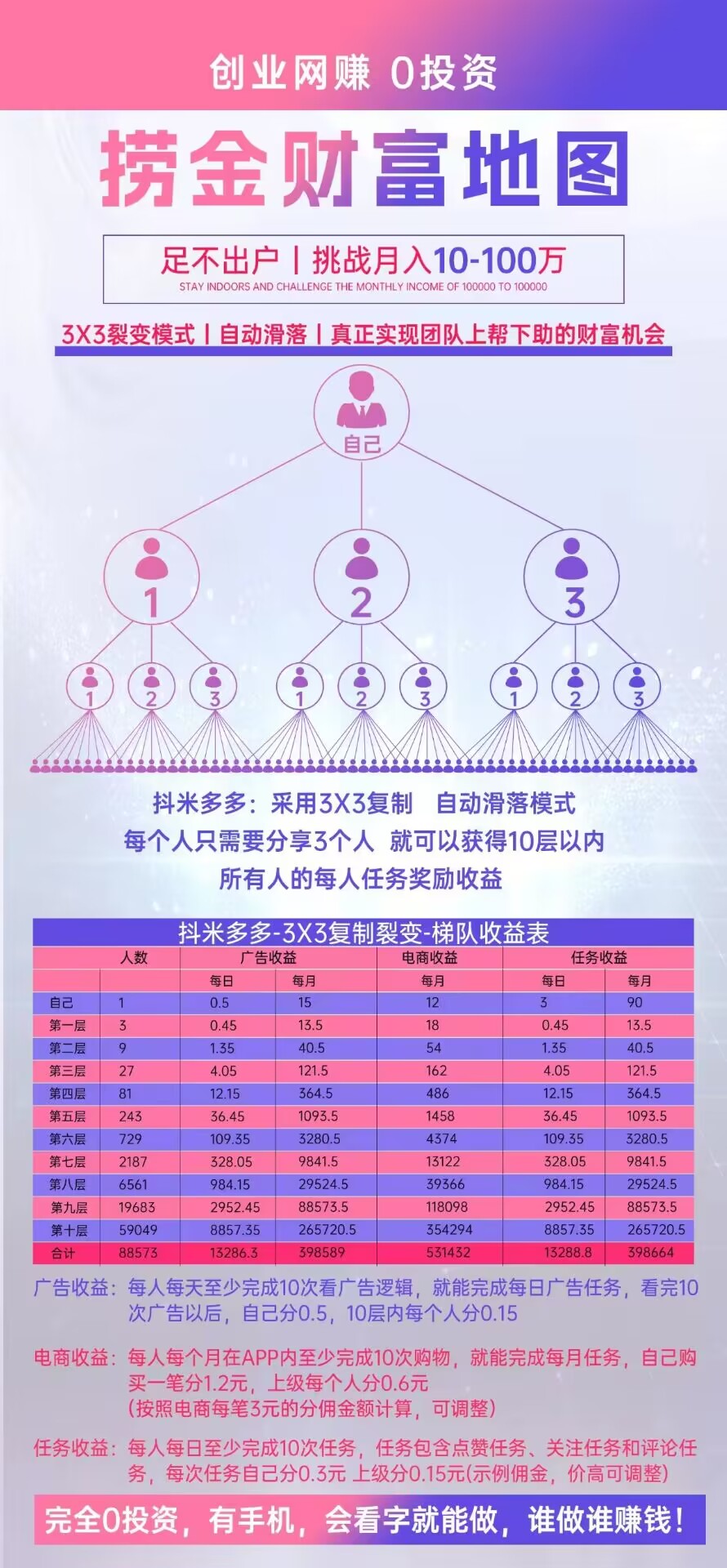 正文 2023黑马项目,抖米多多,震撼来袭 zlj3225105 V评论者 /2023-02-20 12:25:41/5.78 K阅读 0220 抖米多多,2月底即将启动,一手对接,全民赚钱省钱福利补贴,营销任务电商类一站式移动数字流量创富平台;业务模型主要是以:广告任务板块+抖客电商购板块+悬赏任务板块抖米多多有那些优势?优势1 0投资只看广告做任务就有收益优势2 每个人只需要分享三个人就可以裂变团队,赚取管道收益优势3 可以赚10层网体的收益优势4自动滑落的方式,更容易裂变团队,上下帮扶抱团取暖,不用担心自己组建不了团队问题。首码接入Q群:296778768三个板块的裂变收益,具体如下!