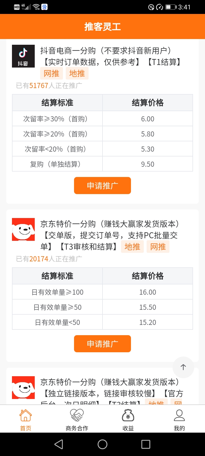 当然任务数量质量很重要,目前看推客灵工做的比较不错,平台分类一目了然电商、出行、下载单、***等等任务非常全面,而且不少还能地推操作,比如近期的京东系列任务就特别棒,并不是常见的一分购、特价版之类的老任务,而是全新小程序任务操作超简单授权即可:京东洗衣券、京东乐摇摇、京东趣互联娃娃机,这几个项目都是属于全网独家的!