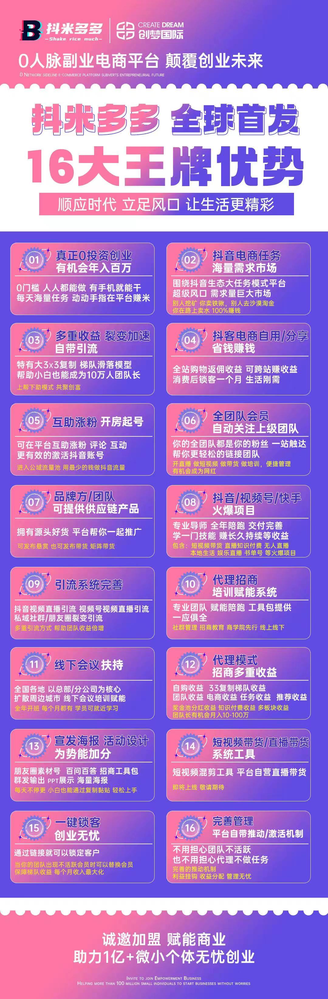 答:抖米多多总部坐落于中国互联网之都“杭州”,是由杭州繁星集团和创梦国际品牌联袂打造。抖米多多是一站式移动数字流量创业便民创客平台,主要是0撸任务创业➕短视频直播电商带货