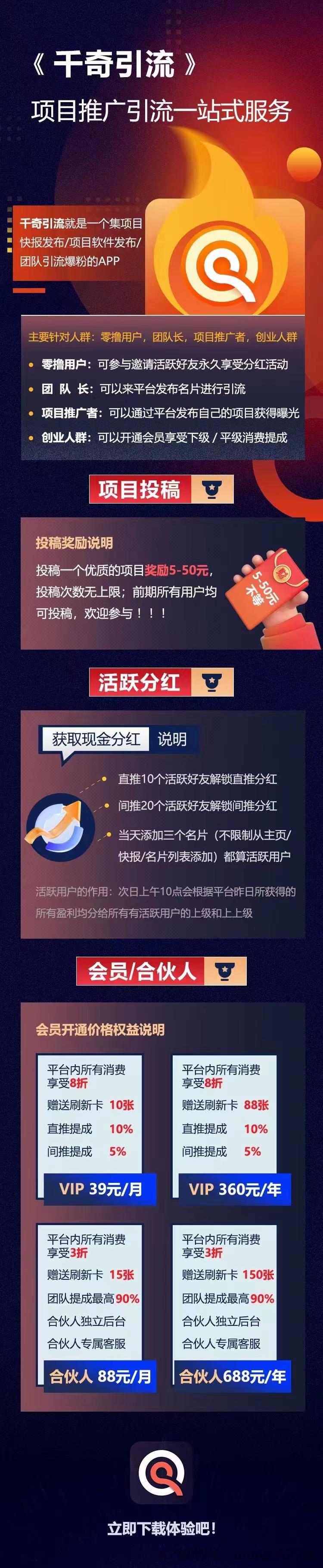 正文 千引奇流邀请好友得分h,一人分h,一元无限累加 LLL V评论者 /2023-02-22 16:26:49/2.62 K阅读 0222 《千奇引流》推客二代微信扫码!免费发布项目打广告,推广效果很好,流量超高, 随便发个项目都有几百个人注册。直推10位好友解锁平台永久分洪10%(邀请1人/天分洪一元)间推30位好友解锁平台永久分洪5%(邀请1人/天分洪0.5元)开通会员我的佣金全反(返70%),提现秒到账。