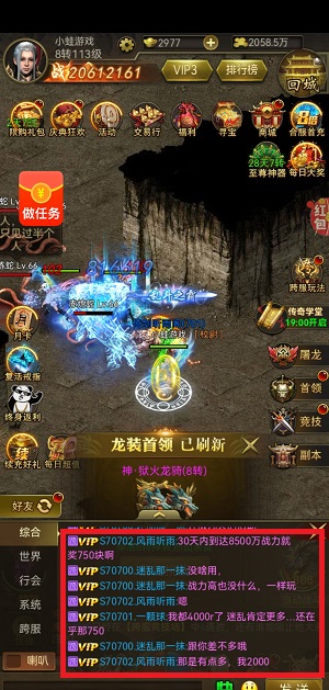 相较于排行榜上的大哥,我这充值10元都不算什么,在跨服聊天中可以看到,前三个基本上都是充值4千以上的大哥,毫无疑问是来体验游戏快感的,我就是陪大哥玩,寻味这次待的区服是我试玩传奇游戏以来质量最高的!同样的试玩时间,前面榜一最多3-4千万战力。所以不要觉得人家试玩赚了很多钱,很多时候充值都是亏钱的!