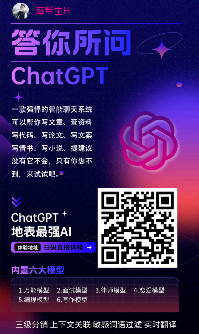 正文 ChatGPT分销系统推广,公众号、网站、app升级 微信做单30元一单 V评论者 /2023-02-26 14:31:32/2.95 K阅读 0226 ChatGPT分销系统企业推广 该项目可以不用梯子就可以直接与ChatGPT对话交流佣金价格200元一单,可以申请成为代理销售 电销或有互联网产品销售的伙伴优先 资源图片: