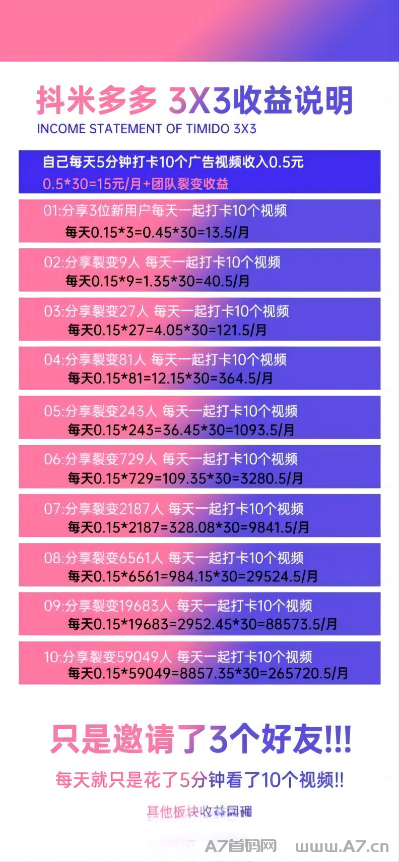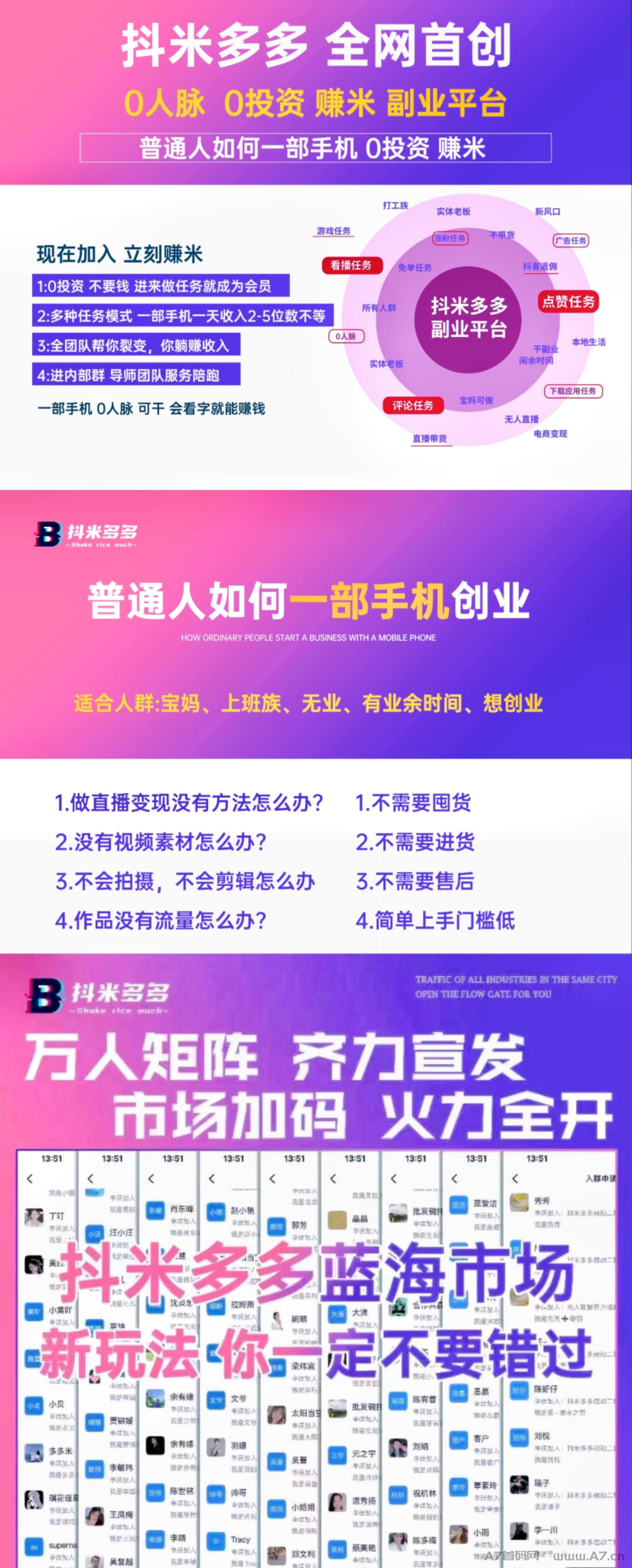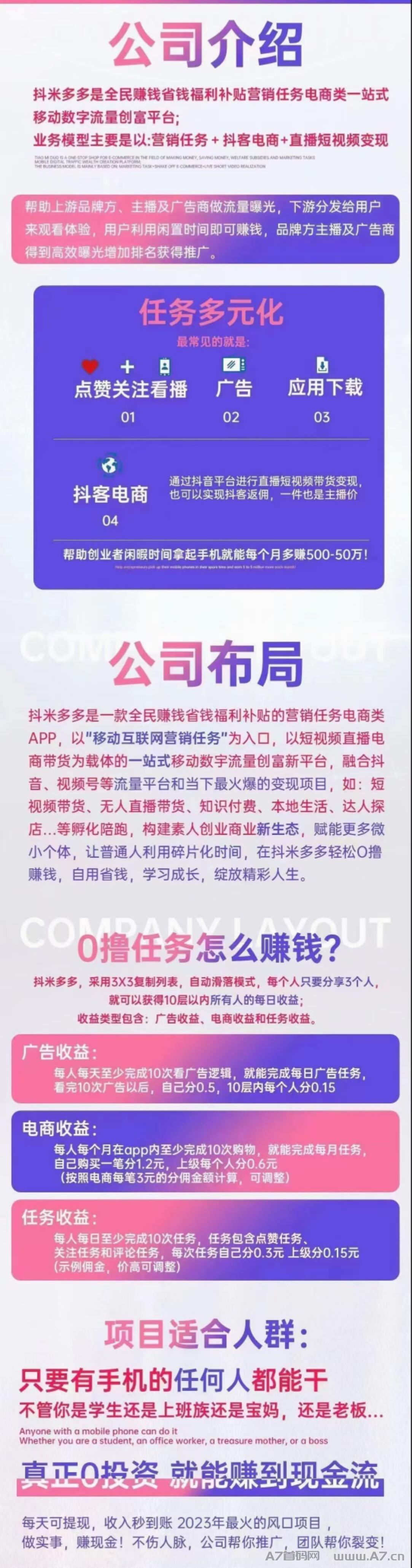 正文 【抖米多多】0撸自动滑落,三三复制 金女士 V评论者 /2023-02-28 10:15:44/1.73 K阅读 0228 【抖米多多】超强0撸,三月初左右上线,预热中!三三复制,10层滑落,一共9万人!【第一板块】广告收益,滑落9万人,每人每日给你贡献0.15元=日入1.3万元!【第二板块】电商收益,滑落9万人,每人每月给你贡献12元=月入53万元!【第三板块】抖音点赞关注,滑落9万人,每人每日给你贡献3元=日入1.3万元!三大板块,各不干扰,一次锁粉,享受三份收益!