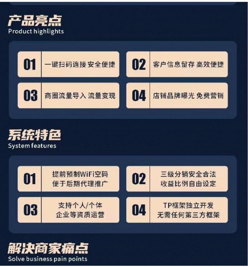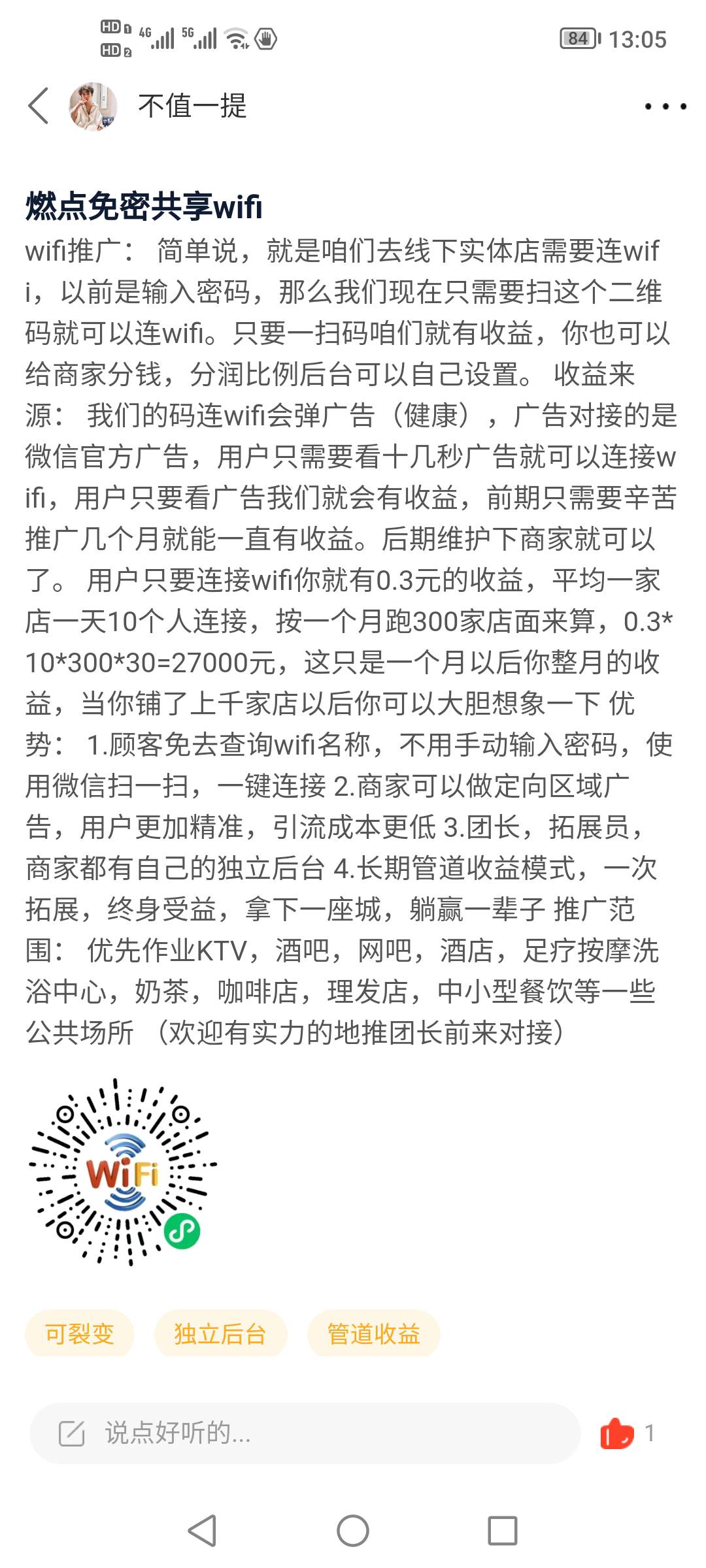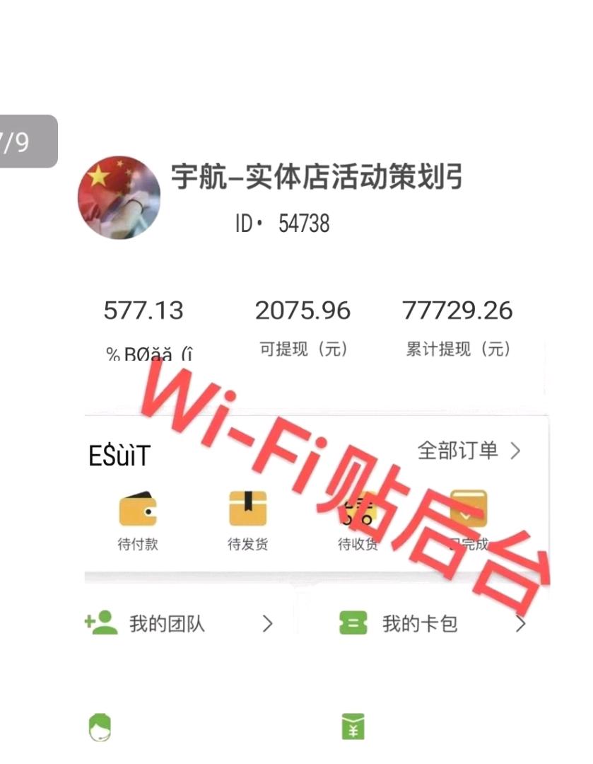 咱们这个业务是推广wifi码,与商家wifi绑定,用闲置的wifi对接腾讯广告流量主实现变现的 每有一个用户连接wifi,拓展员收益是一次0.3元,团长端后台收益是0.5元,团长可招收拓展员 资源图片: