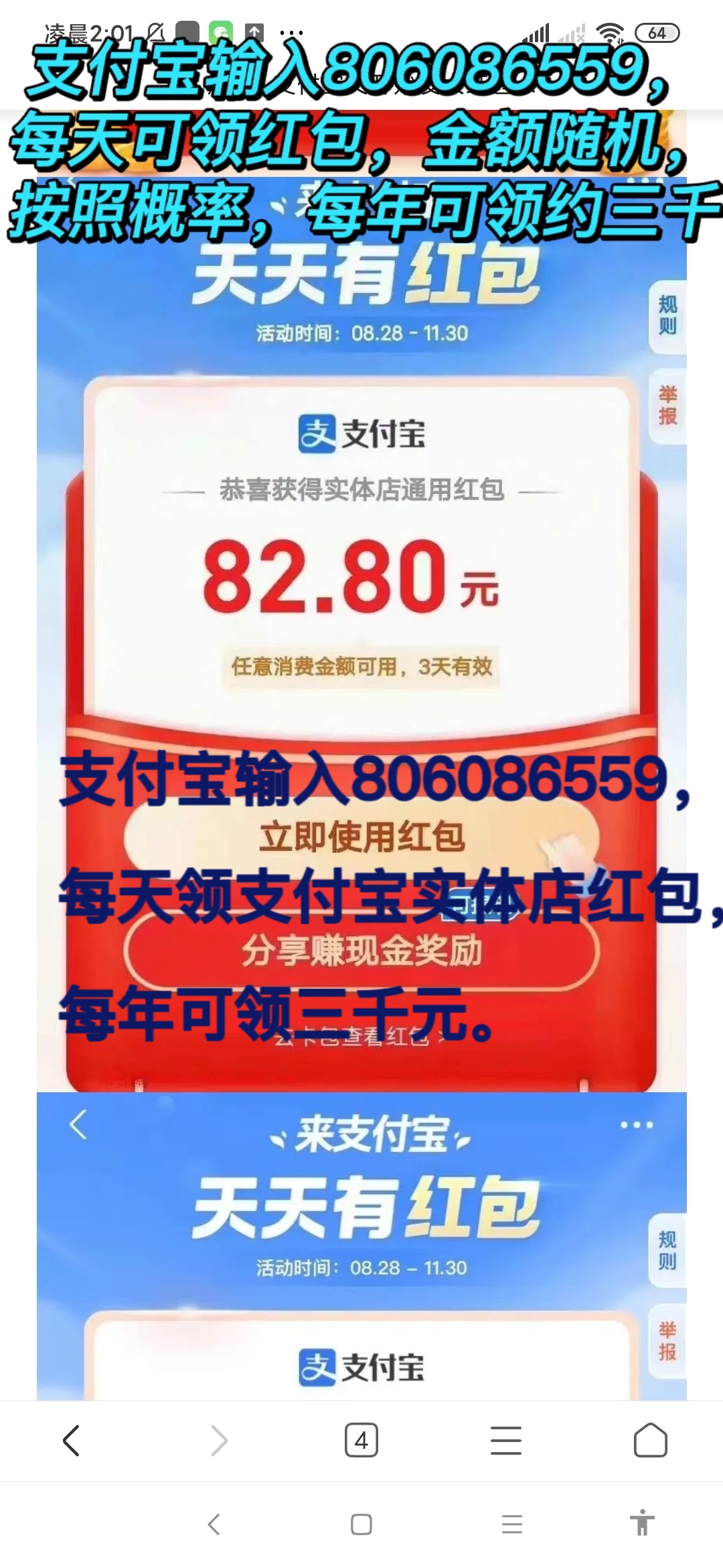正文 支付宝红包/每月可领三千元/每天免费领 app推广注册接单平台 V评论者 /2023-02-28 03:47:03/1.87 K阅读 0228 支付宝红包佣金价格0.01——99结算方式秒结操作流程大家好,支付宝输入806086559,每天领支付宝实体店通用红包,每年可领三千元。 金额随机,有几分的,也有几十几百的。每天可领一次,每天输入数字就可以领。 每天领,每个月都可以领到好多次几十的红包。按照概率,每年可领三千元左右。 领过后忘记这串数字也没关系,领过一次后,以后再领直接打开支付宝点击“放大镜”搜索,即可在历史记录看到这串数字,先领券后消费,用支付宝在实体店消费自动抵扣。资源需求每个人都可以领取 资源图片:
