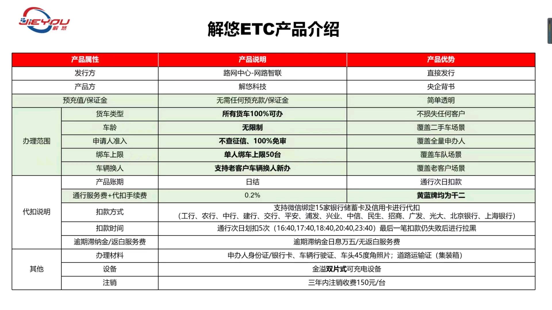 1.渠道具备自有营销渠道,有地推、直销、抖音电商渠道者最佳。 2,合作需要签订合作协议。 3.拿货需要支付设备押金(50元/套),押金可滚动拿货。不发行可退押金。 4.公司合作结算开3%的专票,自然人合作走云账户结算(税费6.8%) 5.发行ETC产品时需要详细为客户讲解产品内容,不能进行违规营销动作,欺骗用户。 资源图片: