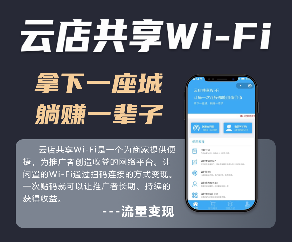 正文 云店共享WiFi,直招服务商,免加盟费,秒结算 app推广拉新一手渠道 V评论者 /2023-02-28 04:16:40/3.35 K阅读 0228 【云店共享WiFi】官方直招服务商,最稳定结算的平台佣金价格0.3-0.5元/次结算方式秒结操作流程你只需要把专用的WiFi二维码张贴在实体店,顾客扫码连接WiFi后,你都能获得0.3元/次的收益,并且立即到账到你的微信! 每张二维码都将长期为你创造收益,随着你推广的商家越多,你的收益也越多。资源需求地推网推 资源图片: