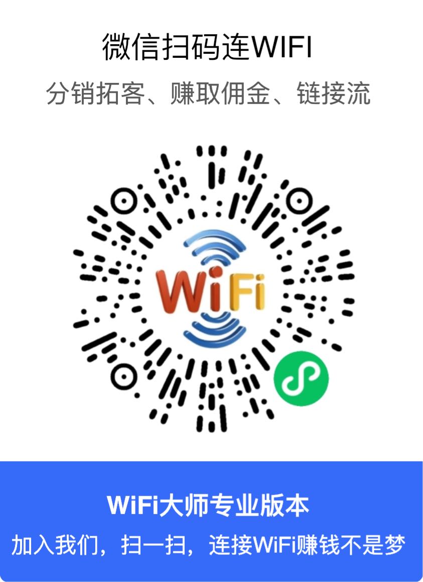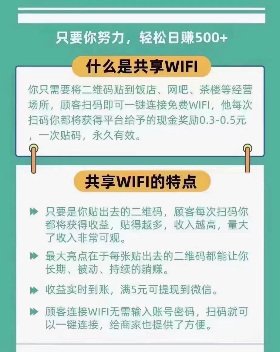 wifi 推广:wifi 推广: 简单说,就是咱们去线下实体店需要连 wifi ,以前是输入密码,那么我们现在只需要扫这个二维码就可以连 wifi ,只要一扫码咱们就有收益,你也可以给商家分钱,分润比例后台可以自己设置。别人连一下 wifi 你就有最低0.5的收益,平均一家店一天100人连 wifi 你一个月按最低标准300家店面:0.5x100x300=15000元这只是一个月免费上车
