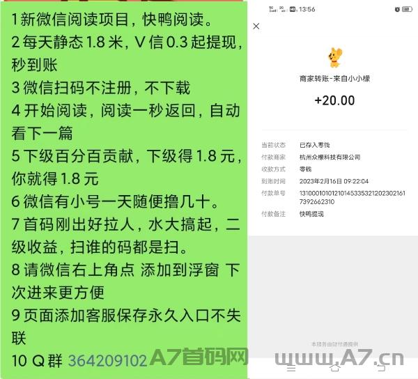正文 首码刚出一秒,新版本快鸭微信阅读 初心项目对接 V评论者 /2023-03-03 16:32:25/2.32 K阅读 0303 1新微信阅读项目,快鸭阅读。2每天**1.8米,V信0.3起提现,秒到账3微信扫码不注册,不下载4开始阅读,阅读一秒返回,自动看下一篇5下级百分百贡献,下级得1.8元,你就得1.8元6微信有小号一天随便撸几十。7首码刚出好拉人,水大搞起,二级收益,扫谁的码都是扫。8请微信右上角点 添加到浮窗 下次进来更方便9页面添加客服保存永久入口不失联10 Q群364209102