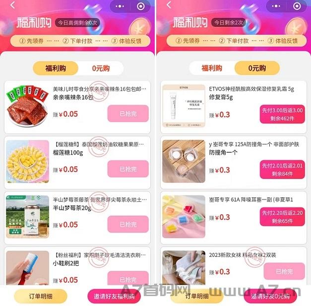 首页~福利购~0元购,一般2-5元小商品,复制口令到抖音购买,订单明细能看到自己订单,等确认收货好评,平台返还本金,1元提现秒到账,点一下好评截图,到平台上传截图自动通过,收货到提现1分钟搞定很容易。