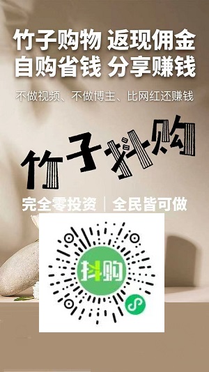 竹子抖购,每天4单0元购,免费拿小商品,额外每单0.3元佣金,也就是每天1.2元,一个月白拿120件商品和36元现金,多号多得。