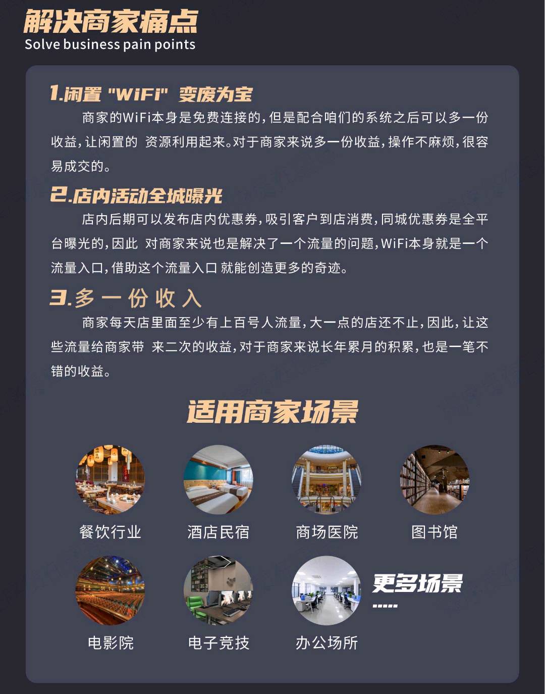 共享WiFi基础资料简介 免费wifi(扫码一键链接wifi) 服务4000万实体商家升级数字门店。 推广类型:地推B端、独立后台 结算方式:T+0 (日结) 佣金收益:0.3-0.5元/次、收益最高0.5元/次连接 推广产品详情: 地推内容:给商家推荐扫码一键连wifi,主要找人流量大,餐饮等客人在店时间长的,只要商家有wifi,我们就给他贴一张绑定商家wifi账号密码,客人只需要扫码即可连接,每次连接推广者有0.3元≤收入。项目非常好推,长期管道收益。【地推】收益举例:你自己每天跑10家,一个月推了300家,连接推的单价0.3元/连接,假设每个店每天10个有效链接,一个月的收益就是:5*10=750元/天,一个月收入2-3万,持续不断作业推广,收入持续增长。大干三个月一天收入2000元多(后续跑的收入越来越高)
