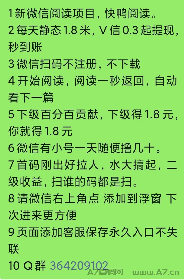 正文 快鸭阅读,每天薅羊毛 海哥 V评论者 /2023-03-03 23:15:32/2.43 K阅读 0303 1新微信阅读项目,快鸭阅读。2每天**1.8米,V信0.3起提现,秒到账3微信扫码不注册,不下载4开始阅读,阅读一秒返回,自动看下一篇5下级百分百贡献,下级得1.8元,你就得1.8元6微信有小号一天随便撸几十。7首码刚出好拉人,水大搞起,二级收益,扫谁的码都是扫。8请微信右上角点 添加到浮窗 下次进来更方便9页面添加客服保存永久入口不失联10 Q群 364209102