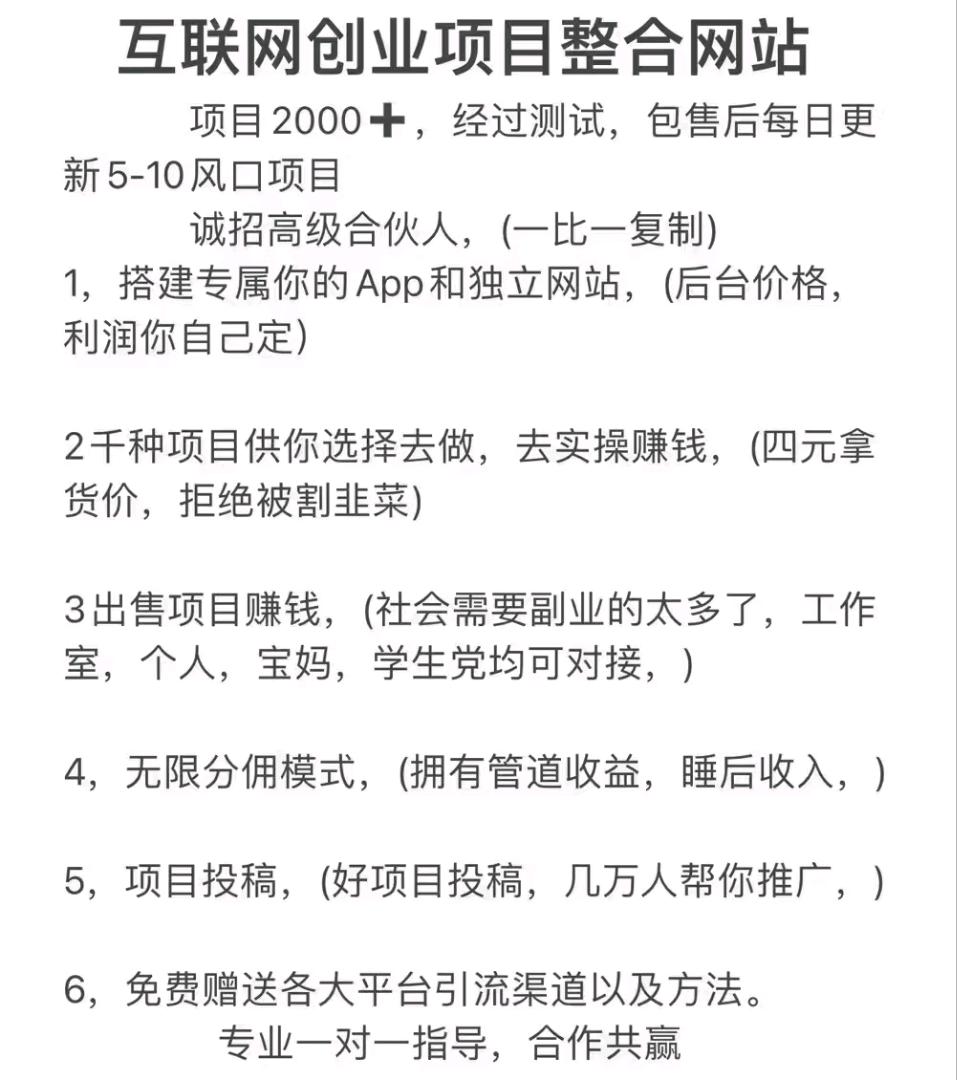 正文 全网上千种最火爆的项目,全部只要4元,招聘合伙人 app拉新推广怎么做 V评论者 /2023-03-04 08:07:47/2.58 K阅读 0304 适合人群:个人,找项目,小白,宝妈,工作室,创业者 1,加盟平台合伙人:会给你开通独立后台,平台上面3000多个互联网创业项目,后台可(自己定价格),可招代理合伙人,实现管道收益 2,网拥有完善的平台系统,搭建独立的项目资源和平台APP永久的使用权(拥有属于你自己独立的app) 3,每天都会更新5-20个项目,确保项目和**是最新的。让你在互联网赚钱的方式更简单,成本更低 4,利润收益:月收入1-5W能力强者上不封顶 其他补充说明:免费添加微信咨询,加微信就送20个互联网落地项目 资源图片: