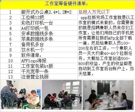 提供500多款APP,有简单下载注册类,日常应用,试玩类型,金额、银行、证券类,是以工作室的模式来做的,你需要做的就是招聘兼职人员来你们工作室,让他们用自己的手机把所有需要拉新的APp全部下载一遍,然后给兼职人员100-200左右的工资,一个兼职人员一天大约做40-60个拉新任务,大概给工作室创造500-800的收益,产生的收益都是自动到工作室后台账户上,当天结算