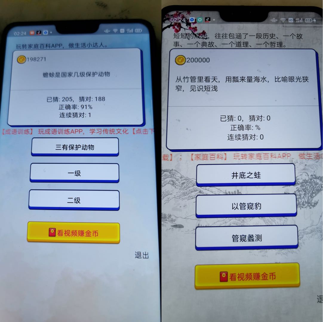 有4个app(前期上两个,后期四个),每个app每天可以刷125条广告视频,正常每条视频时间为30-40秒,每条广告视频2000金币(折合人民币2毛钱),意味着每个app收益为25米每天,两个app加起来50米