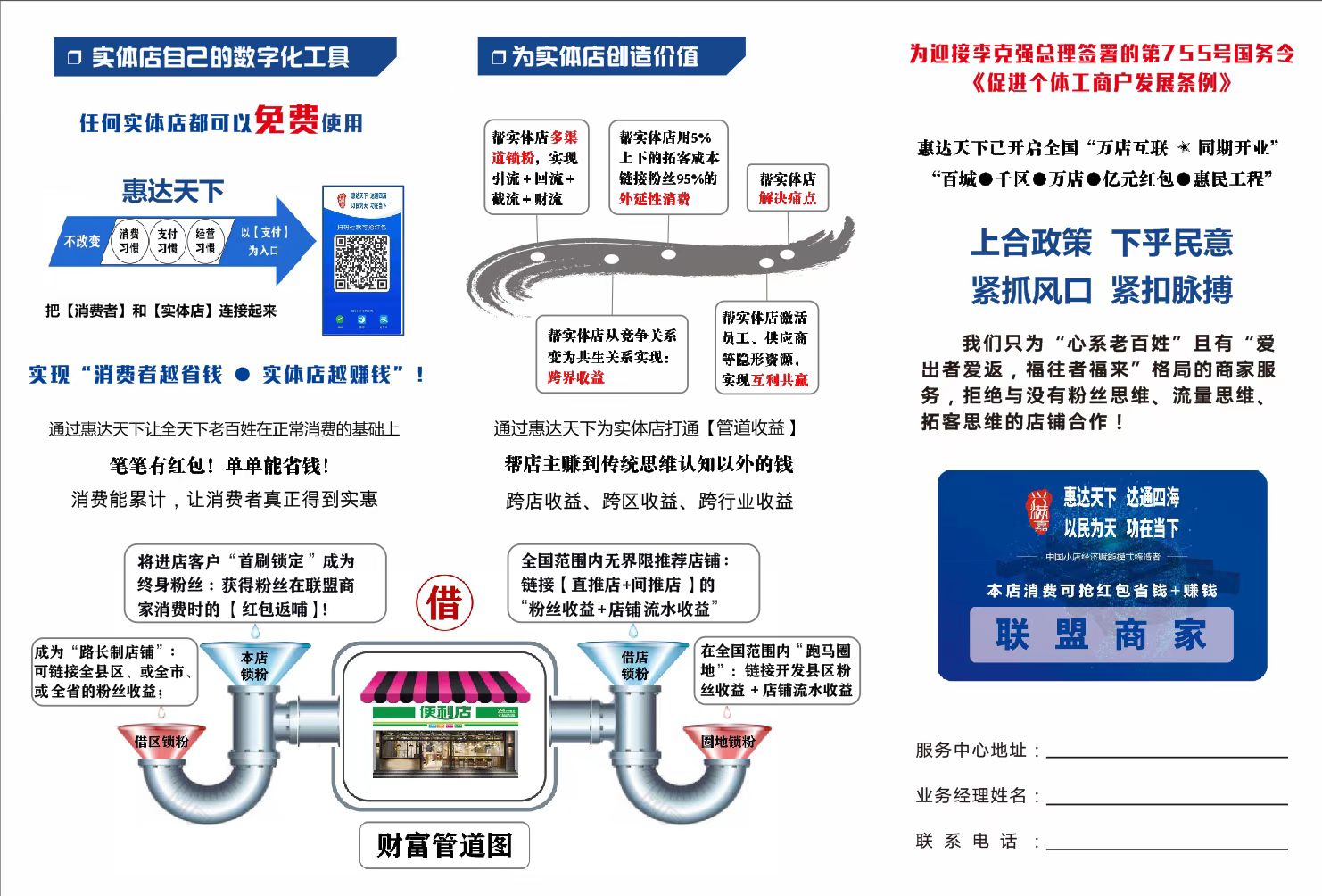 上海兴满嘉秉诚“以振兴实体经济为己任、帮实体店的生意好起来”的企业使命和“利他达 人、彼此成就、共生共荣”的经营理念。响应**七部委颁布的《关于开展小店经济推进行动的通知》,经过四年的沉淀和积累,成功研发了极具裂变功能的“互联网+营销系统” (即:惠达天下·中国小店赋能模式暨数字化智慧营销系统)。为小微商户、个体商户等实体店整合信息、渠道、流量、集聚区等小店商业资源,形成资源共享的生态链,对刺激进店消费、激活市场活力、促进实体经济、安排就业等具有重要的现实意义,真正实现万店互联、万物互联、万人互联! 上海兴满嘉惠达天下数字化智慧营销系统帮助实体小店另外搭建一条除原有仅靠赚差价以外的生钱管道,开启万店互联、跨界收益……
