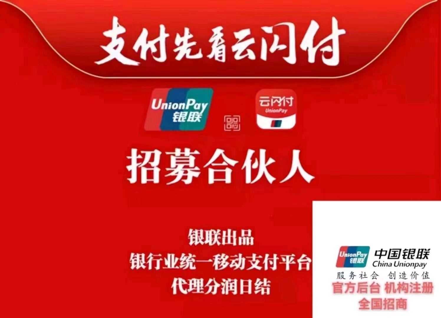 中国银联官方产品,**品牌,强势背景,安全放心! 无代理费无押金,独立官方后台,分润万12起,银联官方日结分润,开户奖励240/户!可地推可网推,全国推广招商,不限区域! 资源图片:
