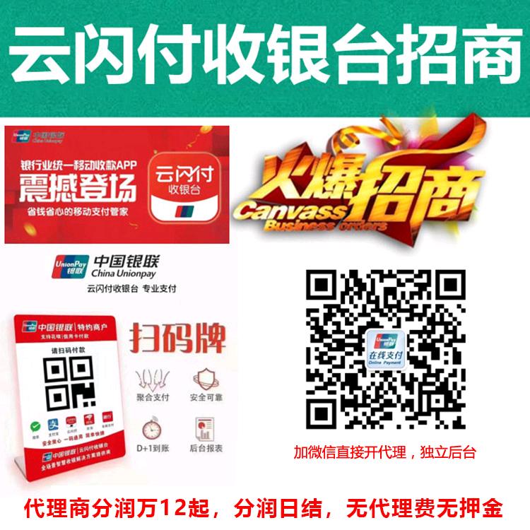 云闪付收银台诚招代理 1.银联官方产品,**品牌影响力 2.标准费率0.38%,支持***花呗 3.D+1结算,节假日正常到账 4.支持微信支付宝云闪付京东及银行 APP 5.有无执照都可开户,单笔5万不限额 6.公司执照可以开通法人对私结算 7.智能语音播报,商家对账功能 8.可参加银联云闪付的优惠活动 9.独立代理后台,无代理费无押金 10.代理分润万12起,分润自动日结不扣税