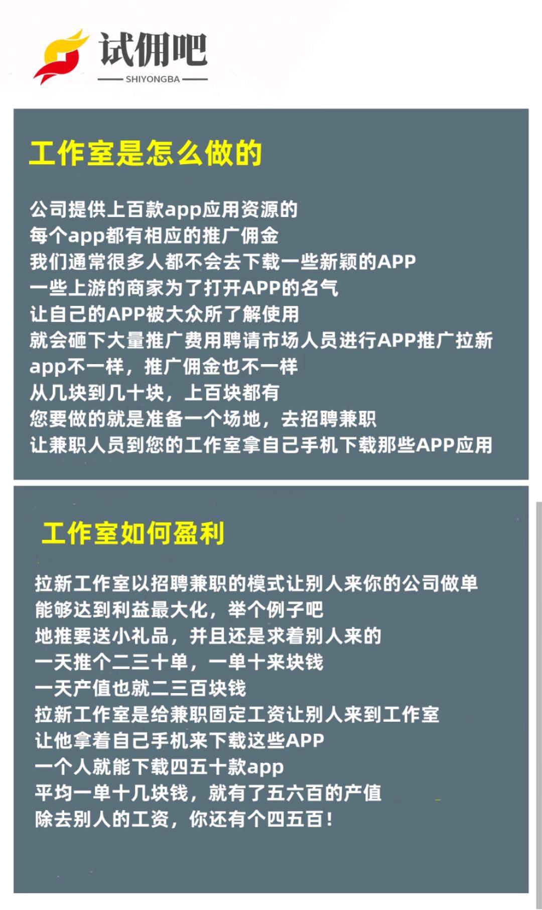 合作概述 APP拉新风口项目,合伙人以工作室形式招兼职下载注册APP,招的兼职越多产值越多,项目简单门槛低 项目介绍 自有平台,3年稳定的一手渠道资源 快手极速版:40 京东特价:16 天猫复购:18 陶特:16 美团社群:7.5 联通王卡:42 移动花卡:38 番茄小说:7.5 交通养老金90 交通期货115 工行养老金68 !总任务数有七八百款!更多任务请十V咨询合作要求 1:想创业或想转型的老板 2:有创业想法,想赚钱,有耐心 3:网推或者开一个工作室,招聘兼职,让兼职下载APP注册充量,只要能招到兼职,就能挣钱,公司提供招聘渠道和方案方法 A自渡: !总任务数有七八百款!更多任务请十V咨询合作要求 1:想创业或想转型的老板 2:有创业想法,想赚钱,有耐心 3:网推或者开一个工作室,招聘兼职,让兼职下载APP注册充量,只要能招到兼职,就能挣钱,公司提供招聘渠道和方案方法 收益利润 一手渠道不抽佣,当天结算,一个兼职人员一天可为工作室带来500-800的纯利润 A自渡: 费用说明 有少量端口服务费,按照合同要求完成任务可以退还,门槛低,利润高。 6扶持培训 建立服务群为每一位客户全程多对一帮扶,协助工作室选址,系统使用培训,任务培训,招聘培训圳7其他补充(选填) 公司多年CPA拉新经验,可实地考察,也可线视频考察。合作门槛低,项目简单,上手容易,白嫖勿扰!! 其他补充说明:
