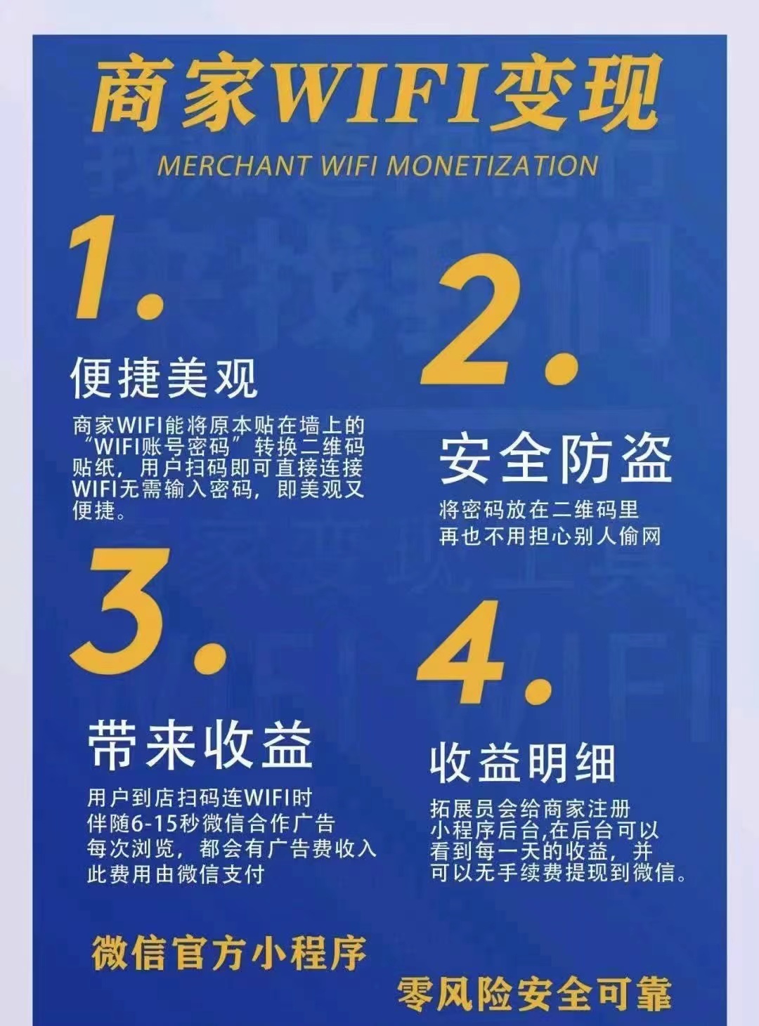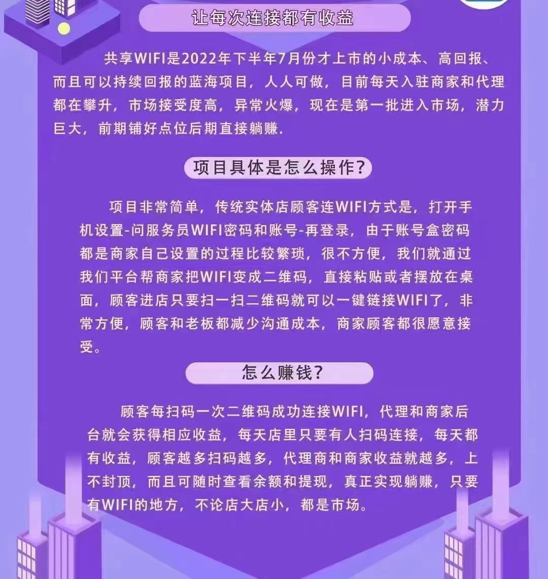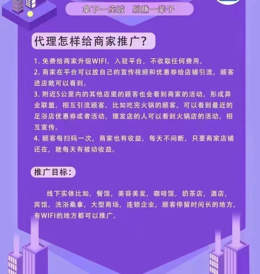 其实推广十分简单,进入线下门店跟老板或者负责人说,帮你免费升级店里的 WiFi,升级 WIFI 对于商户的好处和优势就是 用户扫码商家老板也有收益,收益第二天就显示。商户的收益比例由推广员或者团长直接分配,设置好邀请码。邀请商家入驻,商家有个商户后台,上传自己的门店,商家除了有扫码收益之外,商家可以通过商户后台可自由设置给到店用户发放电子优惠券,活动广告信息,用户扫码连 WIFI 就能看见,吸引客户二次到店消费,增加店铺曝 光,其他商圈流量导入
