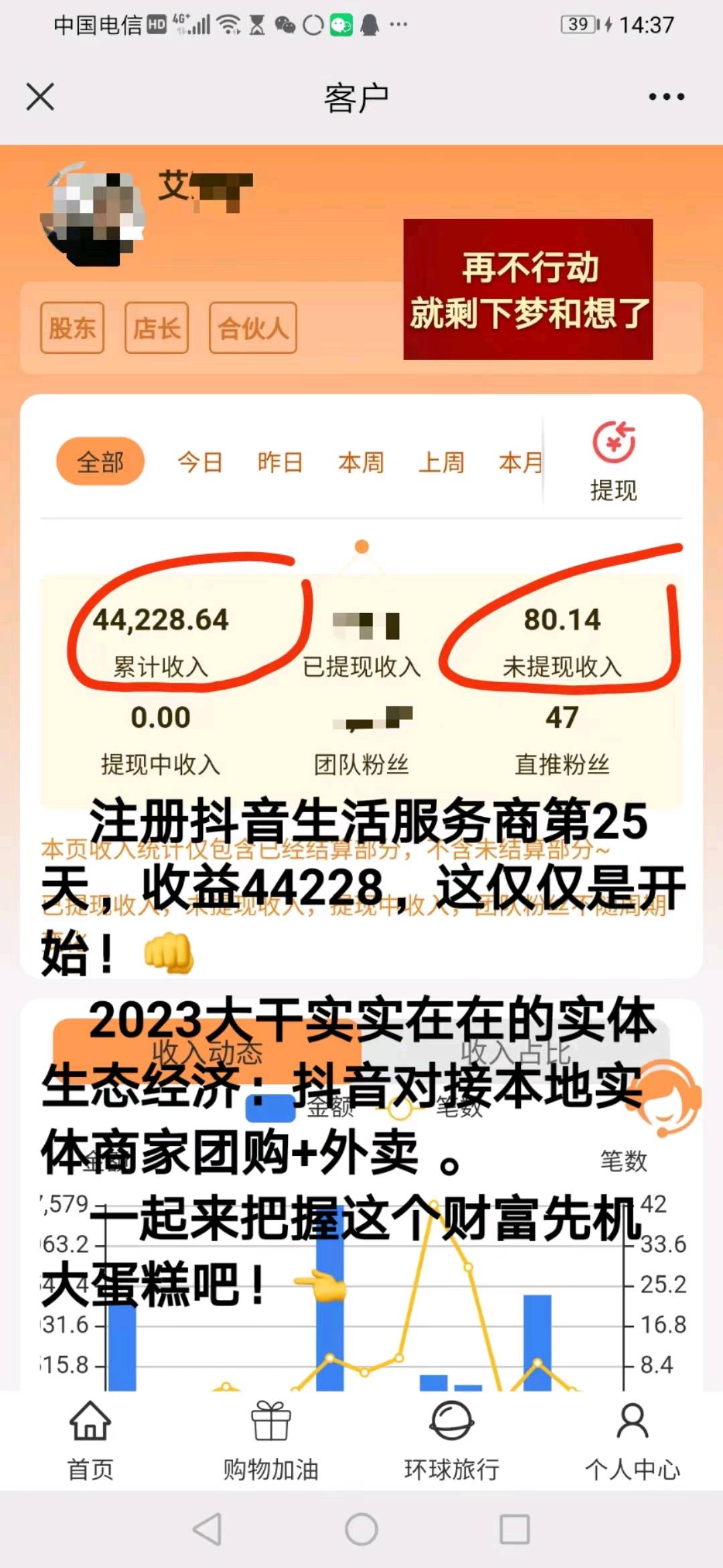 收入一,自己对接商家销售额的百分比(店长5%,合伙人6%,连创7%,股东7%) 收入二,团队直推伙伴对接商家销售额的1%(合伙人及以上才有) 收入三,自己卖出工具包的百分比(店长30%,合伙人40%,联创50%,股东60%) 收入四,10%感恩奖(平级超越奖单笔封顶:店长500,合伙人680,联创9800,股东29800) 收入五,旅游卡月度出游补贴: (联创和股东才有) 20张补贴3000, 50张补贴1万, 100张补贴3万, 200张补贴8万, 500张补贴25万, 1000张补贴60万 旅游卡年度出游奖励: 1000张奖励奔驰c级轿车 3000张奖励玛莎拉蒂跑车 5000张奖励别墅一套 (出游=旅游卡被使用)