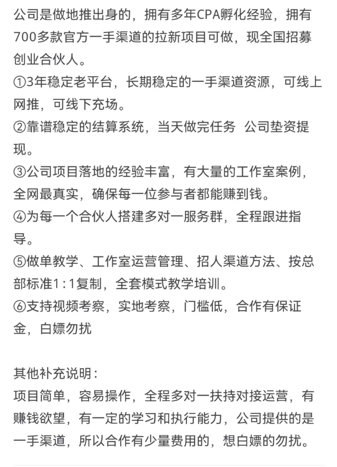 全网最真实,杜绝合作商割韭菜,确保每一个合作商都能赚到钱,公司为每一个客户全程跟踪,实时指导工作室选址运营、维护、做单、招人渠道,网推塔建等等一系列全流程多对一培训及售后服务,低成本创业的不二选择,支持视频考察,实地考察、门槛 低,合作有保证金(可退还)