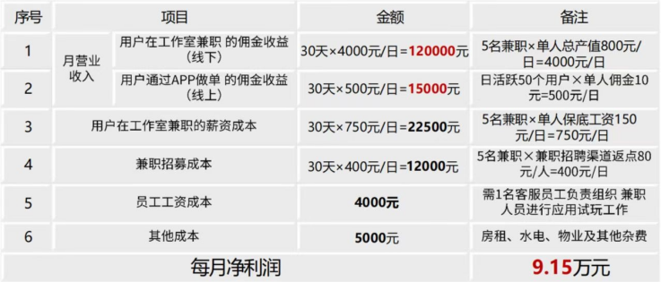 一手渠道 实时审核 当日回款 按目前合作商平均每天5-8人 单人利润300–800 每天有一人兼职纯利单月就能过万 具体和自己执行情况有关 5-8人一天可为工作室带来最少2500-4000收益 平均有5600起每天 保证月均10万以上纯利