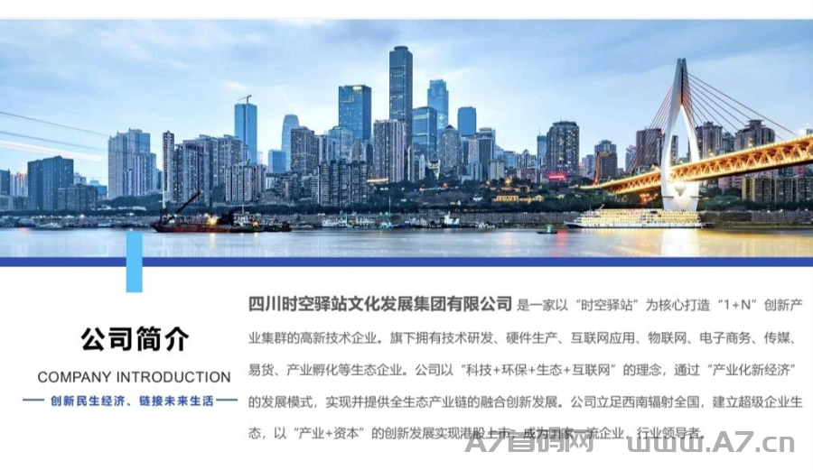 四川时空驿站文化发展集团有限公司是一家以“时空驿站”为核心打造“1+N”创新产业集群的高新技术企业。旗下拥有技术研发、硬件生产、互联网应用、物联网、电子商务、传媒、易货、产业孵化等生态企业。公司以“科技+环保+生态+互联网”的理念,通过“产业化新经济”的发展模式,实现并提供全生态产业链的融合创新发展。公司立足西南辐射全国,建立超级企业生态,以“产业+资本”的创新发展实现港股上市,成为**一流企业,行业领导者。