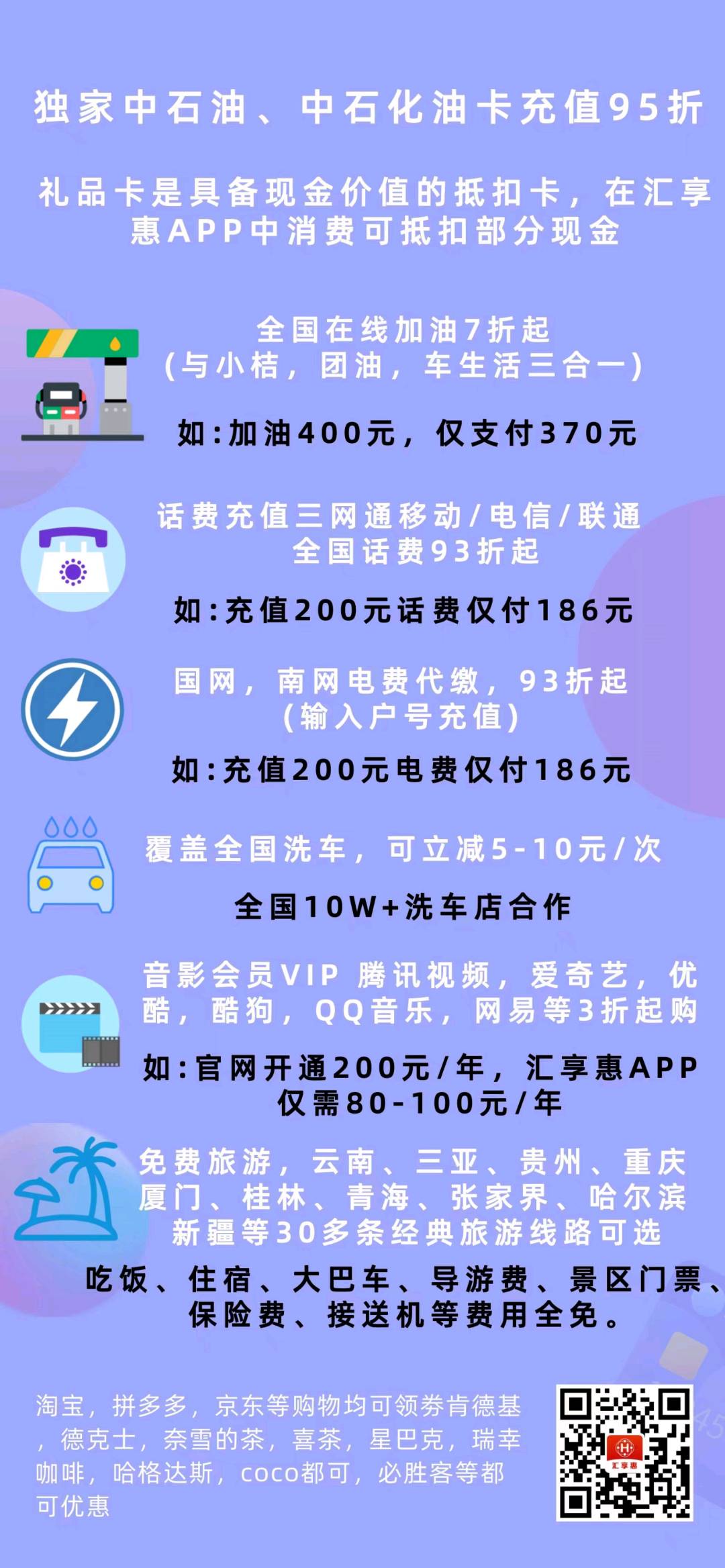1.礼品卡:支持电费、话费、油卡、影视会员充值,折扣全网最低,电费、话费93折,影视会员3—5折,全加油85折起,一次可省20-40元钱,每个客户综合一年可省1—2千块钱。 2.旅游卡:全国30多条路线免费旅游,包吃包住包门票,无强制消费,隐形消费,客户通过自己卡消费,每个提成200—1000不等 3.安全靠谱,已上架运用商店,免费后台,一个后台两个项目,可授权招商。 其他补充说明:
