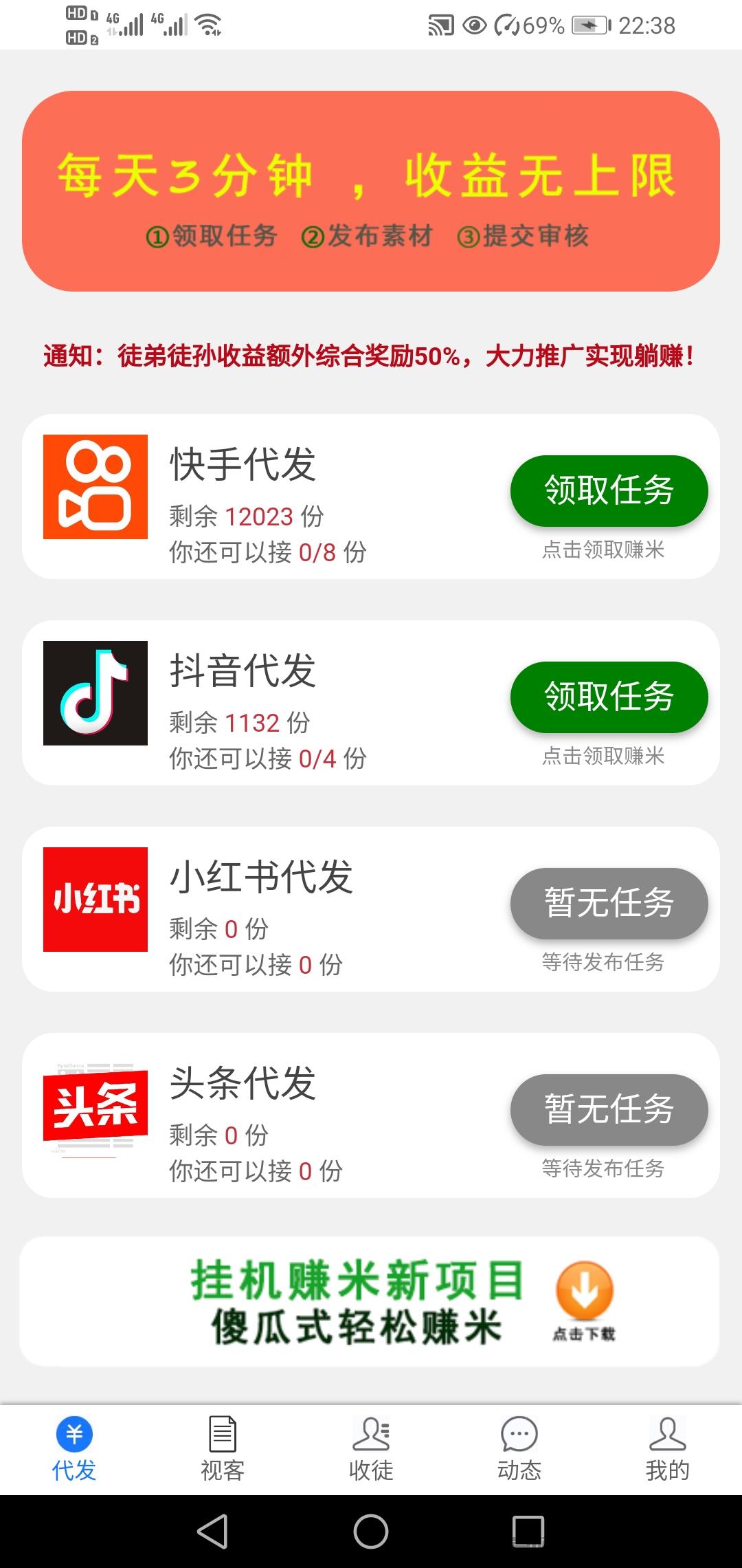 正文 DY 快手代发可无限号代发,推广w限代,收入无上限! dingde113 V评论者 /2023-03-05 20:55:44/2.14 K阅读 0305 点点代发﹣快手抖音小红书代发快手抖音小红书头条代发一个号可一天可发4单一单1-7000米,多号多发 获赞多佣更高1米起提支付宝24小时内到.两级返佣一级30%二级20%①浏览器扫码注册下载登陆②首页领取任务,查看视频教程,再点击任务中心,进去根据步骤操作提交注意提交任务后平台24小时初步审核通过发放0.5/单。三天内审核被赞次数发放佣金.http://df.shufavs.com/index.php/user/register/u/571885