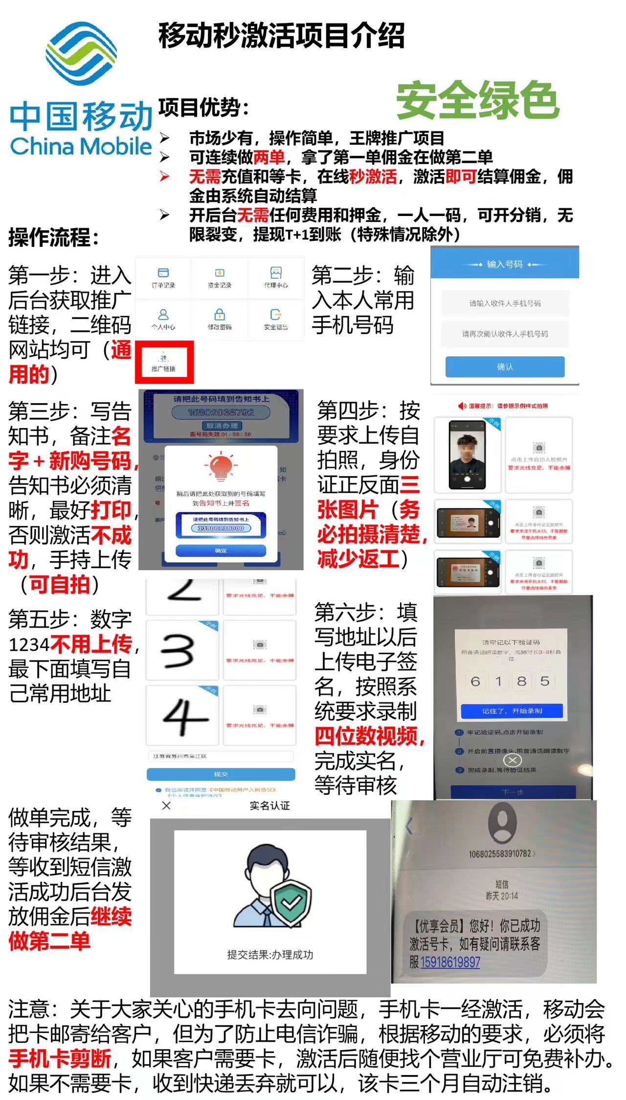 正文 移动线上激活两分钟一单 小程序推广赚佣金平台 V评论者 /2023-03-07 13:40:36/1.89 K阅读 0307 移动卡线上激活,两分钟一单,每人可连做两单,独立后台,激活秒返,30一单佣金价格60结算方式单结操作流程通过链接,线上选号激活,为了防止倒卖,卡片会折断寄回,三个月自动销号资源需求一切推广资源都可以特别说明线上激活,两分钟一单,每人可连做两单,不用等卡,方便快捷,结算稳定,激活秒返,后台自提 资源图片: