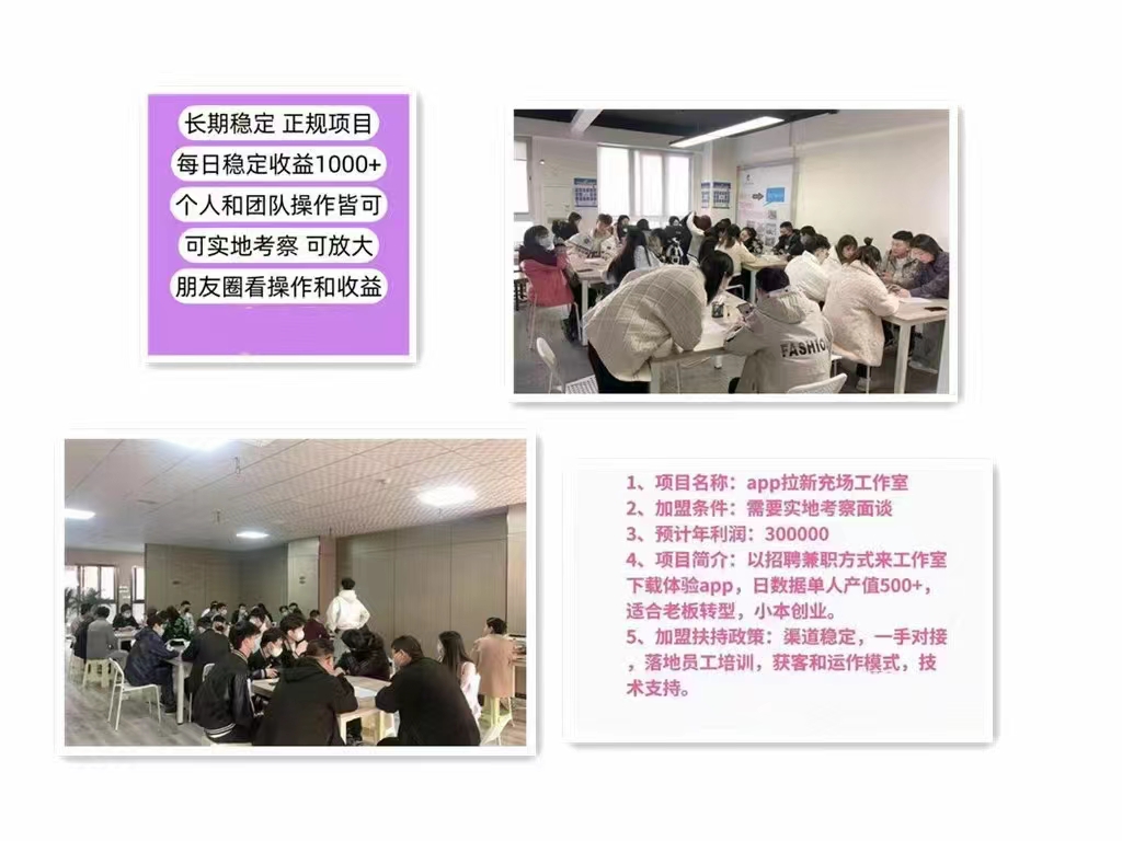 1.产品玩法:地推,网推,充场拉新工作室 年利润100w+ 项目玩法简介: 1.地推免费送礼物鸡蛋等赚取佣金 2.网推宝妈群兼职群裂变下载注册支付一定报酬赚取佣金差价 3.充场工作室以招募兼职的方式让兼职下载app,支付一定佣金 长期稳定的渠道,1:1复制,做单教学,工作室管理运营无经验只要愿意做,我们全程扶持,跟着趋势站在风口上我们合作共赢 我们公司有靠谱稳定的结算系统,当天做完任务当天提现。 全网最真实,杜绝合作商割韭菜,确保每一位参与者都能赚到钱。 公司为每一个客户全程跟踪,实时指导。 运营老师一对一帮扶做单教学,工作室管理运营、招人渠道方法、全程一比一复制 其他补充说明: